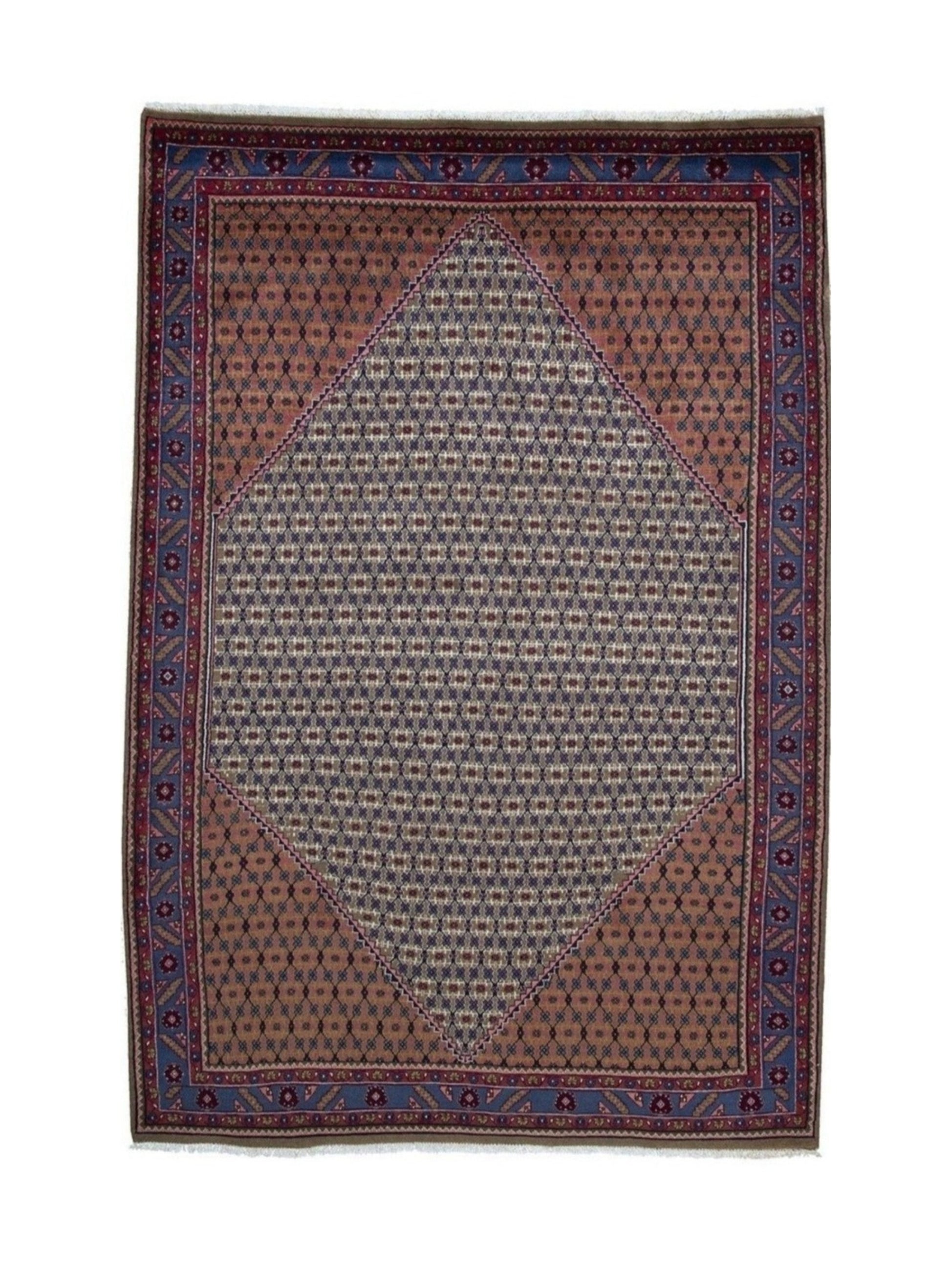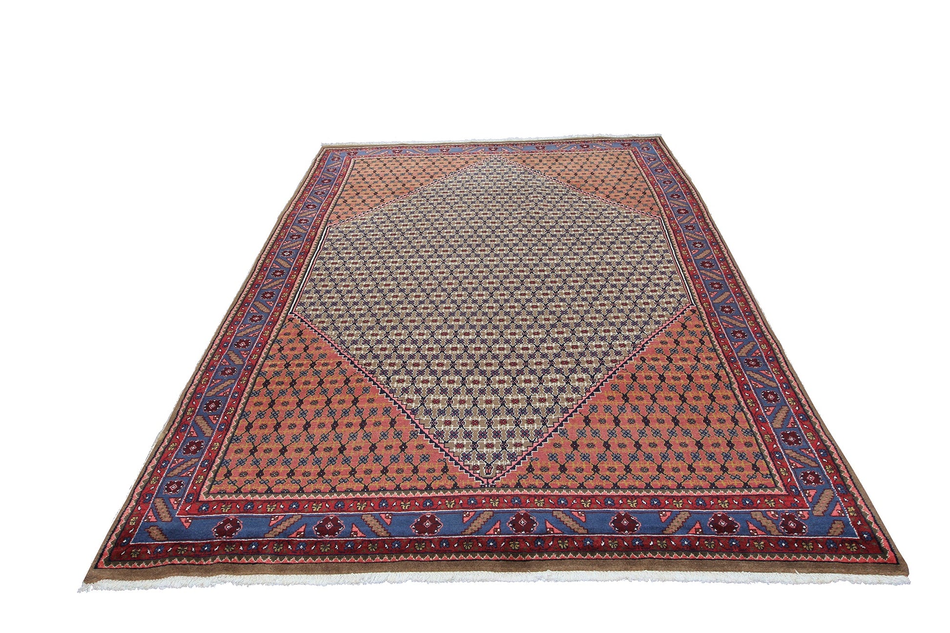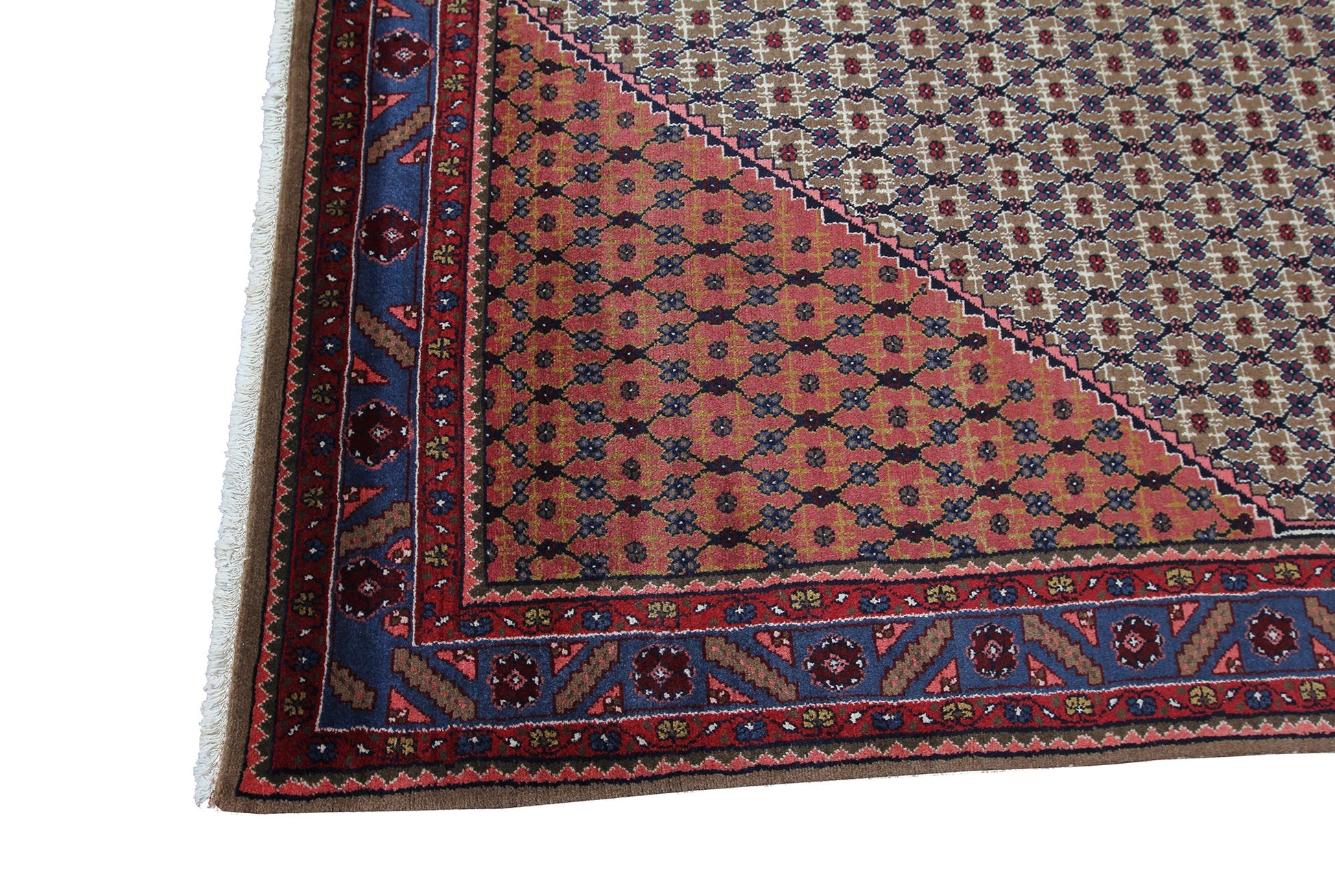 This Persian carpet traditional fish/Herati design is a hallmark of Persian rug making and has been passed down from generation to generation. Its rich colors of red, blue, and beige complement each other perfectly, creating a harmonious and balanced color palette that will enhance any home decor style.