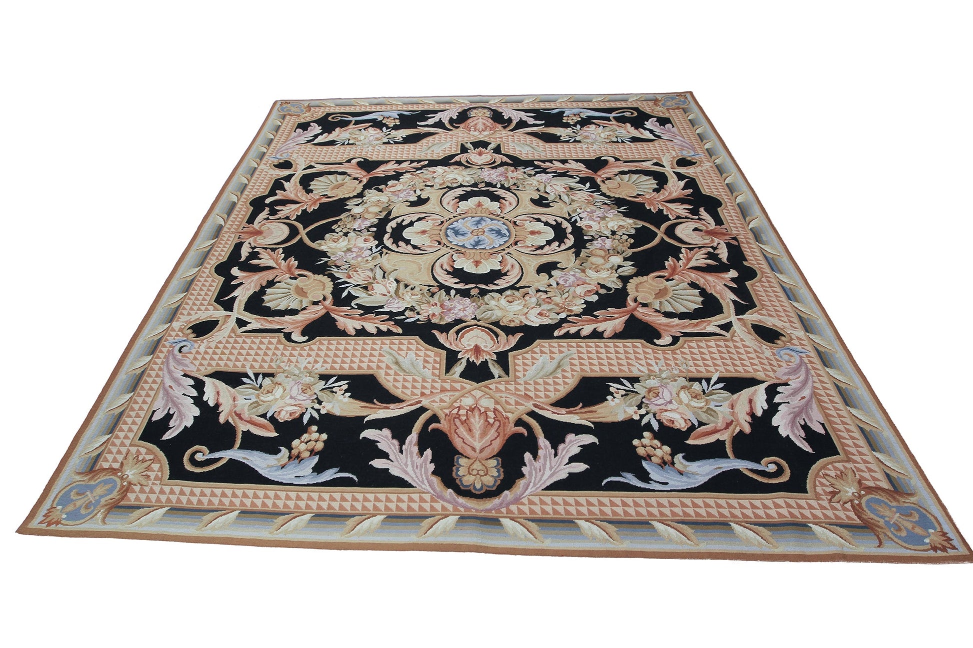 This Chinese rug with a French Traditional design is a true work of art. The rug features a central floral medallion that is surrounded by a border of delicate silhouettes of floral scroll designs, all set on a rich black field. The elegant needlepoint construction and soft, neutral colors serve to further enhance the French-inspired design.