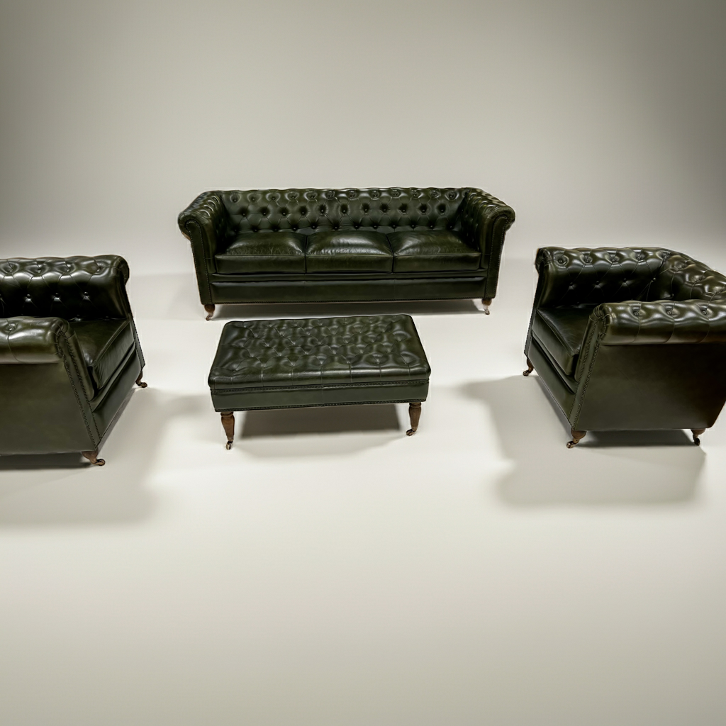 This Green Real-Leather 5-Pieces Living Room Sofa Set combines style and durability to elevate your living space. Crafted with premium green leather, it offers a sophisticated look and easy maintenance. The set includes a sofa, loveseat, 2 chairs, and ottoman, providing versatile seating options. Each piece is designed for comfort with supportive cushioning and sturdy construction, ensuring lasting use. Ideal for both relaxing and entertaining, this set brings refined elegance and practical functionality to your home. Loveseat is not in the pictures.