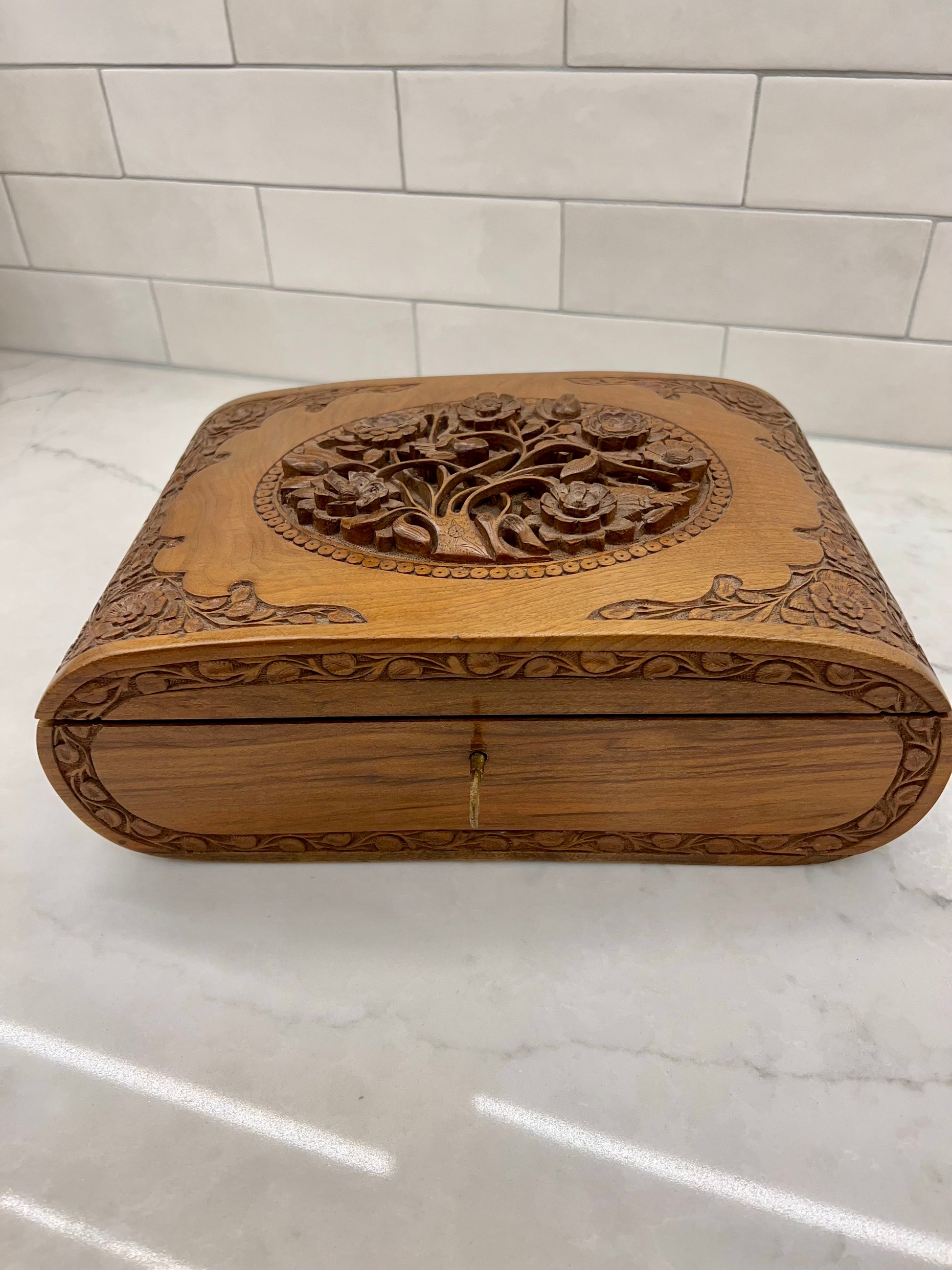 Crafted from premium Kashmir walnut wood, this jewelry box measures 11" long, 7.5" wide, and 3.5" high, offering elegant storage for your valuable accessories. Its sturdy construction ensures durability while the size provides ample space to keep your jewelry organized and protected from damage. Ideal for both display and safekeeping, this piece combines functionality with the natural beauty of rich walnut grain.