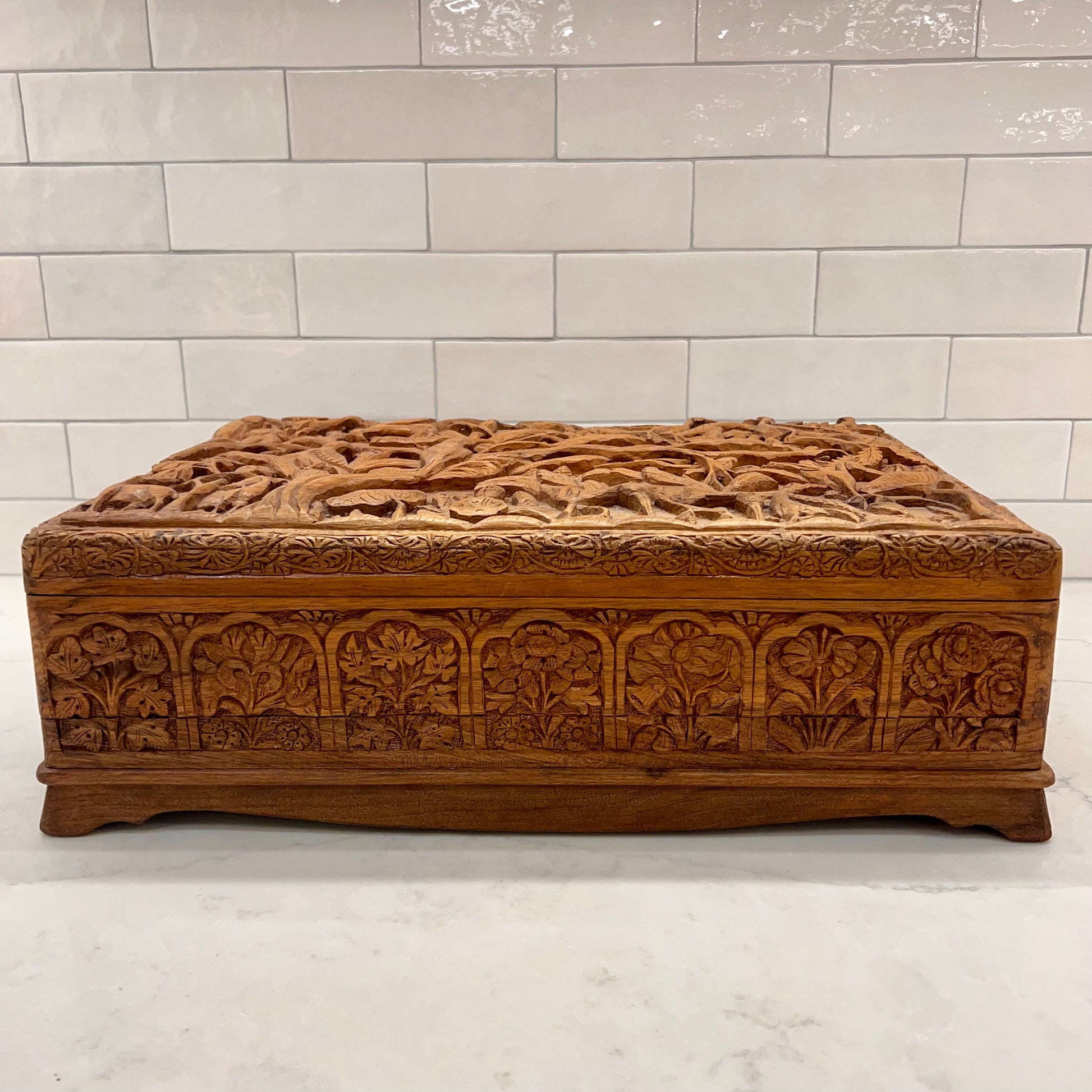 Crafted from rich Kashmir walnut wood, this large jewelry box offers a refined storage solution with dimensions of 12''L x 18''W x 6''H. Its spacious interior is designed to accommodate a variety of jewelry pieces, protecting them in a durable, elegant case. The natural walnut grain adds a distinct aesthetic, ensuring both functionality and timeless style for organizing valuable accessories.