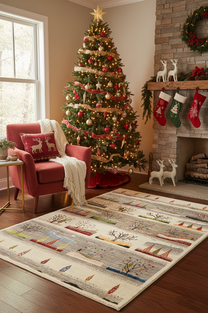 This White Gabbeh-Style Rug adds a touch of elegance to any interior. Handmade in India with 100% wool, this rug features traditional Gabbeh styling for a luxurious look. It features tree figures from different seasons.
